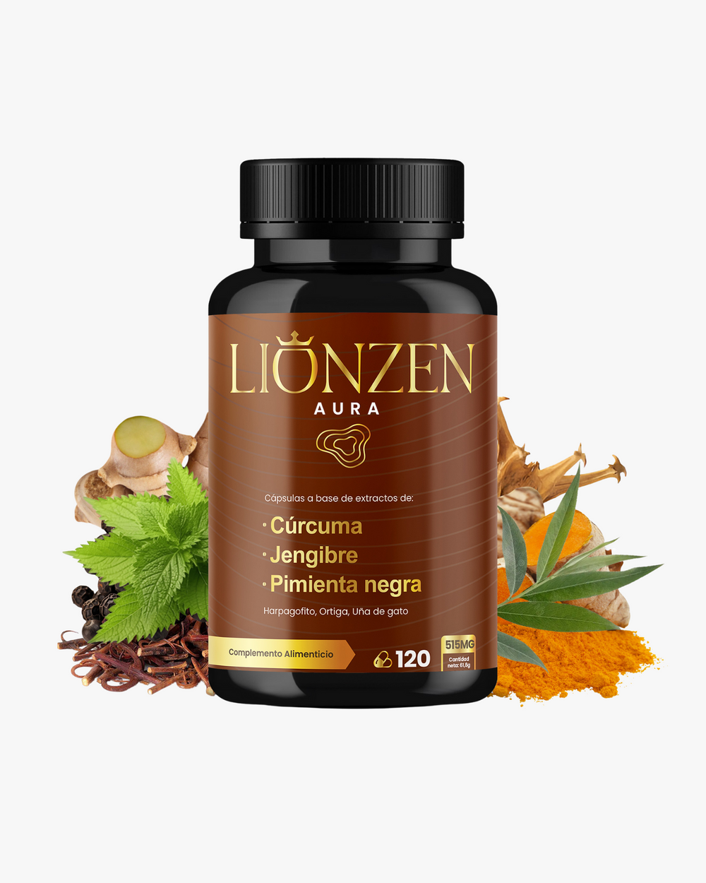 Lionzen Aura no solo alivia las molestias articulares gracias a la cúrcuma, harpagofito y sauce blanco, sino que también incluye probióticos y jengibre para reducir hinchazón abdominal y gases, algo que otros productos no ofrecen.